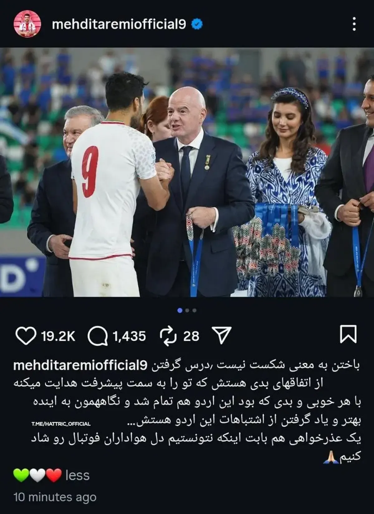 مهدی طارمی، ستاره خط حمله تیم ملی فوتبال ایران، ساعاتی پس از شکست یک بر صفر مقابل ازبکستان در فینال تورنمنت کافا، با انتشار پستی در صفحه شخصی اینستاگرام خود، به این شکست واکنش نشان داد.