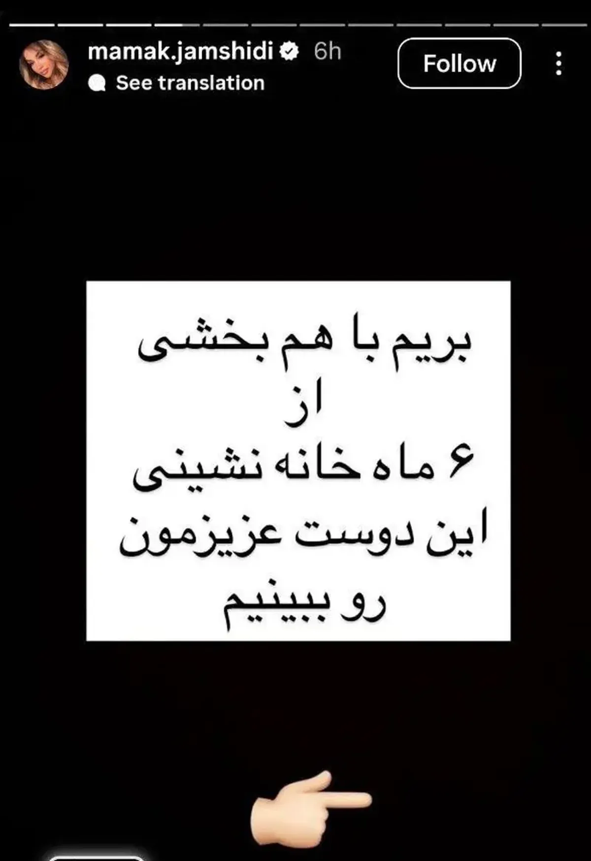 در یکی از این استوریها، مامک جمشیدی نوشته است: «خانم قربانی طفلک نه خواب داشته نه خوراک». همچنین او با اشاره به صفحه شاکی، اضافه کرده: «بریم با هم بخشی از ۶ ماه خانهنشینی این دوست عزیزمون رو ببینیم».